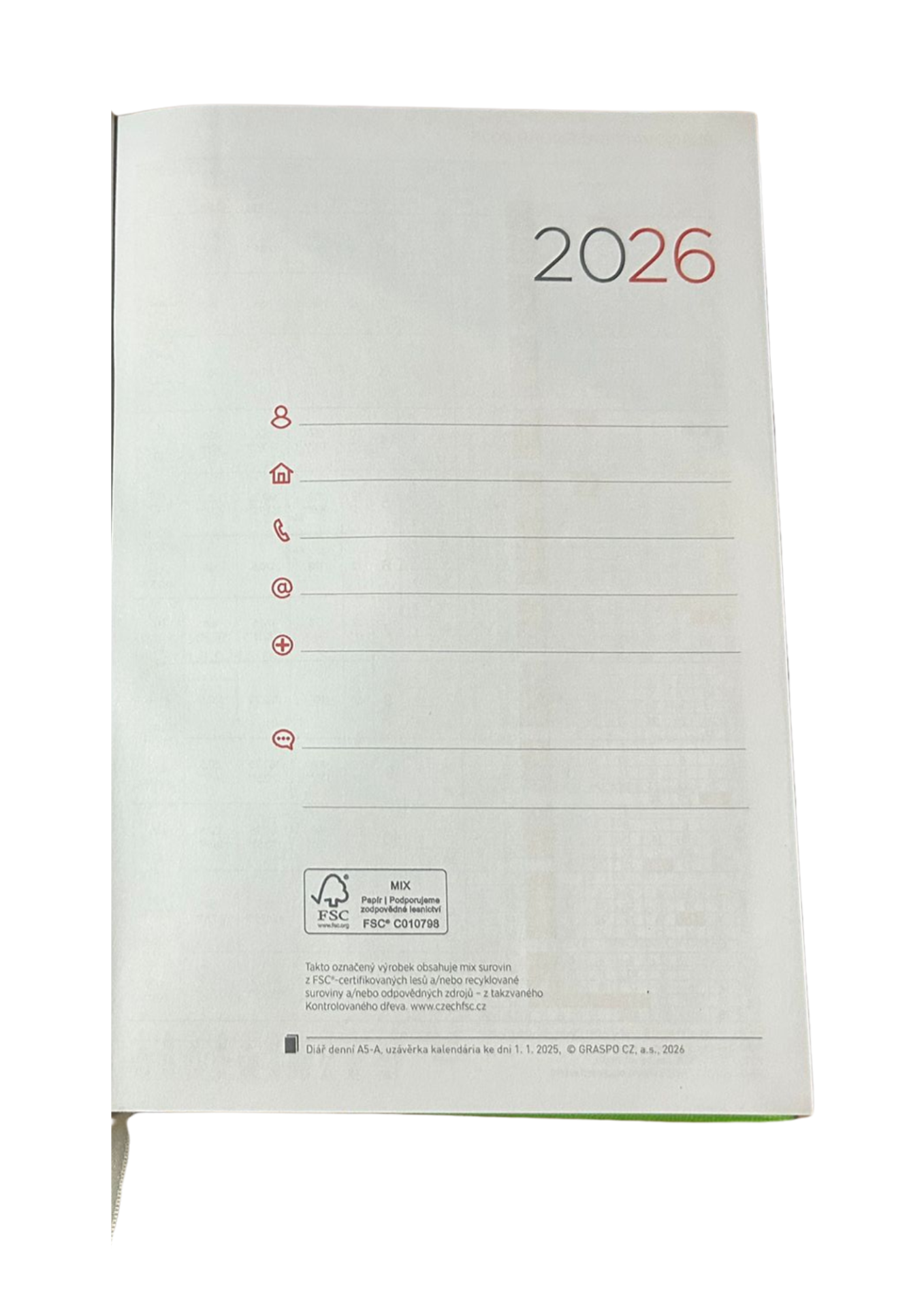 Minimalistický diář na plánování dne. Materiál desek: hladká koženka. Tři barevné varianty.  Vnitřní strany: měsíční plánovač 2025 a 2026, přehledný kalendář 2025 a 2026, plánovací kalendář, daňový kalendář, poznámky. Papír FSC.