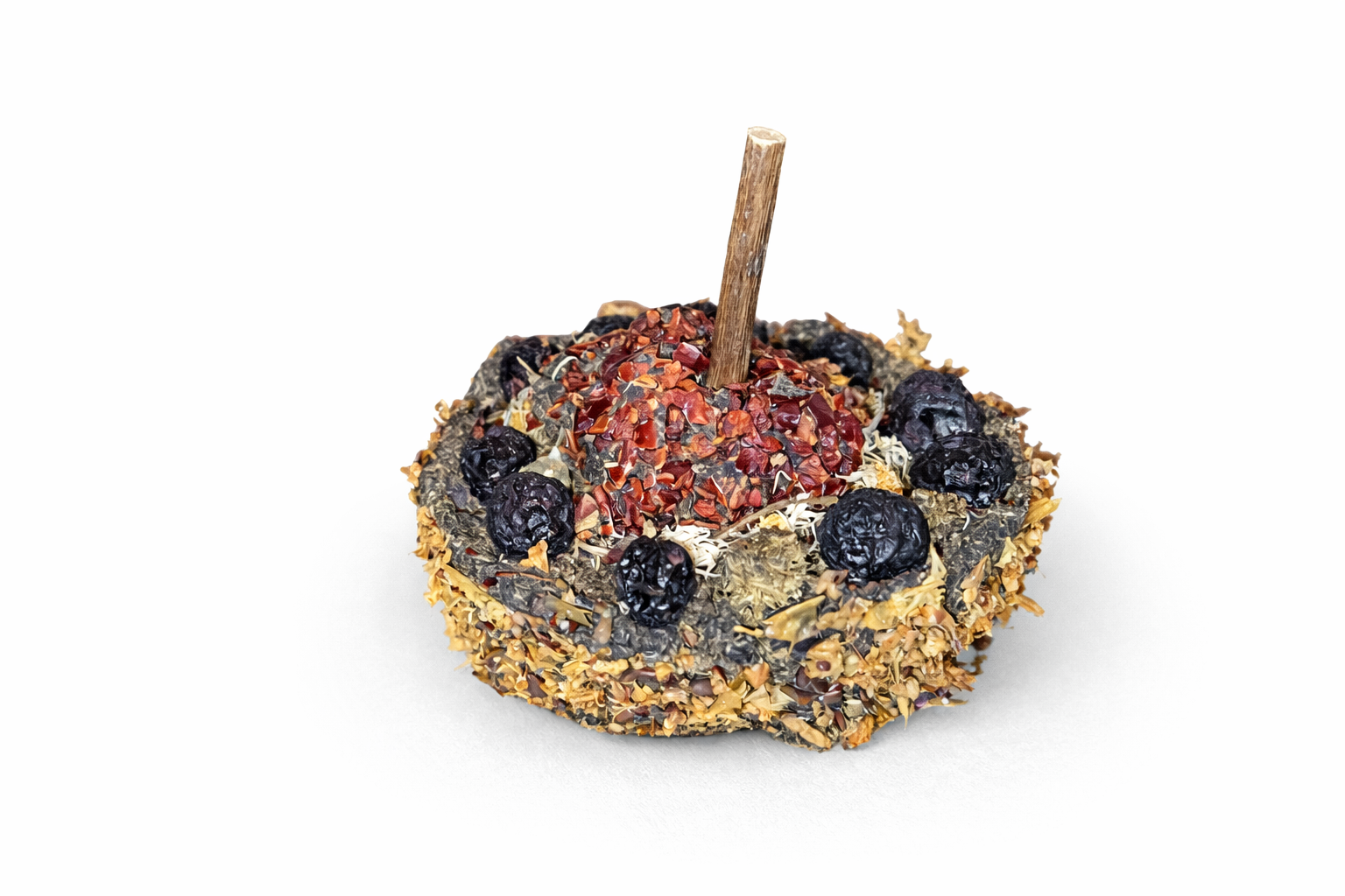 Obsahuje: březovou kůru, zelený oves, sušenou zeleninu (mrkev, celer, petržel, červená řepa), rybízové listy, extrudované lněné semínko, echinacea, měsíček lékařský, ibišek květ, sušené jahody, sušené hrušky, kořen pampelišky, jitrocelové listy, kukuřičné listy, pamlsky - kopřivák, mrkvička, jahůdka, kostička se sedmikráskou, tyčinka s řapíkatým celerem, kolečko s růží, kolečko s koprem, kytička s jablky. Dárek od nás - borůvkový dortík.