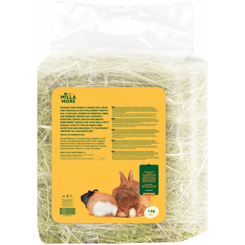Seno je nezbytnou součástí každodenní stravy králíků, morčat, osmáků, činčil a dalších drobných savců. Proto by jim mělo být podáváno v odpovídající kvalitě. Prémiové seno Millamore Timothy Hay z bojínku lučního (Phleum pratense) pochází z nejlepších travnatých polí v Evropě. Je výživné, chutné a představuje bohatý přírodní zdroj hrubé vlákniny (32 %), která podporuje trávení. Díky vysokému obsahu křemičitanů napomáhá také obrušování zubů (včetně stoliček), aby nedocházelo k jejich přerůstání.