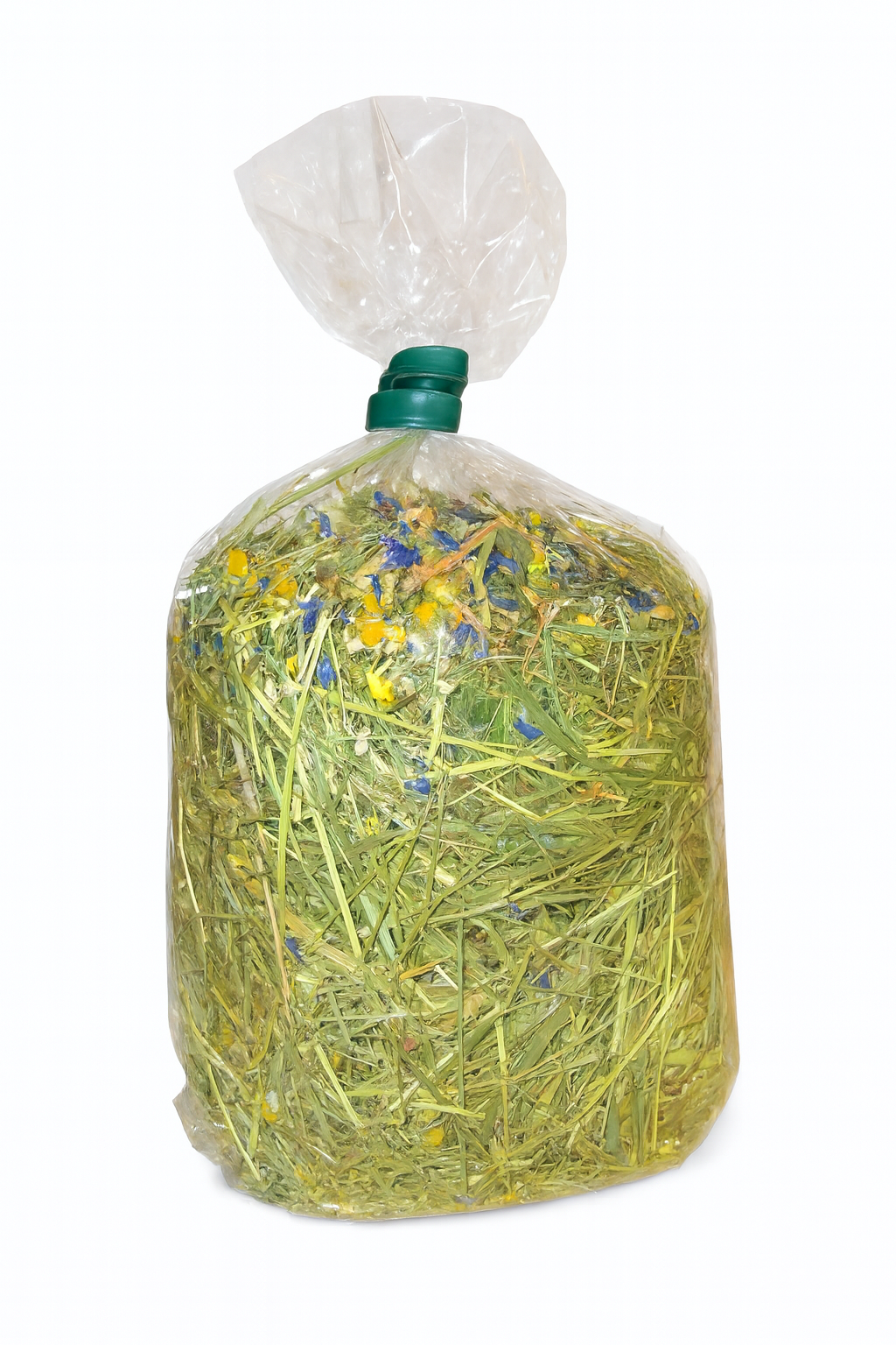 Seno z Jizerských hor s bojínkem, chrpou, jitrocelem a heřmánkem. Seno je krásně zelené. Váha: 90 gramů.